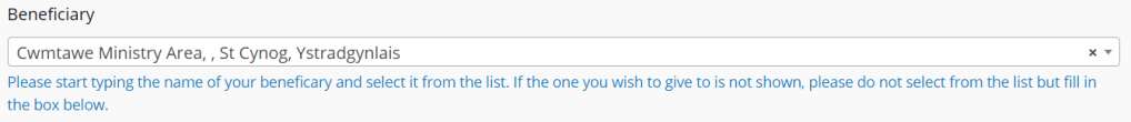 For example, if you would like to donate to St Cynog Ystradgynlais, type “Ystradgynlais” into the “Beneficiary” box and select “Cwmtawe Ministry Area, St Cynog, Ystradgynlais”.